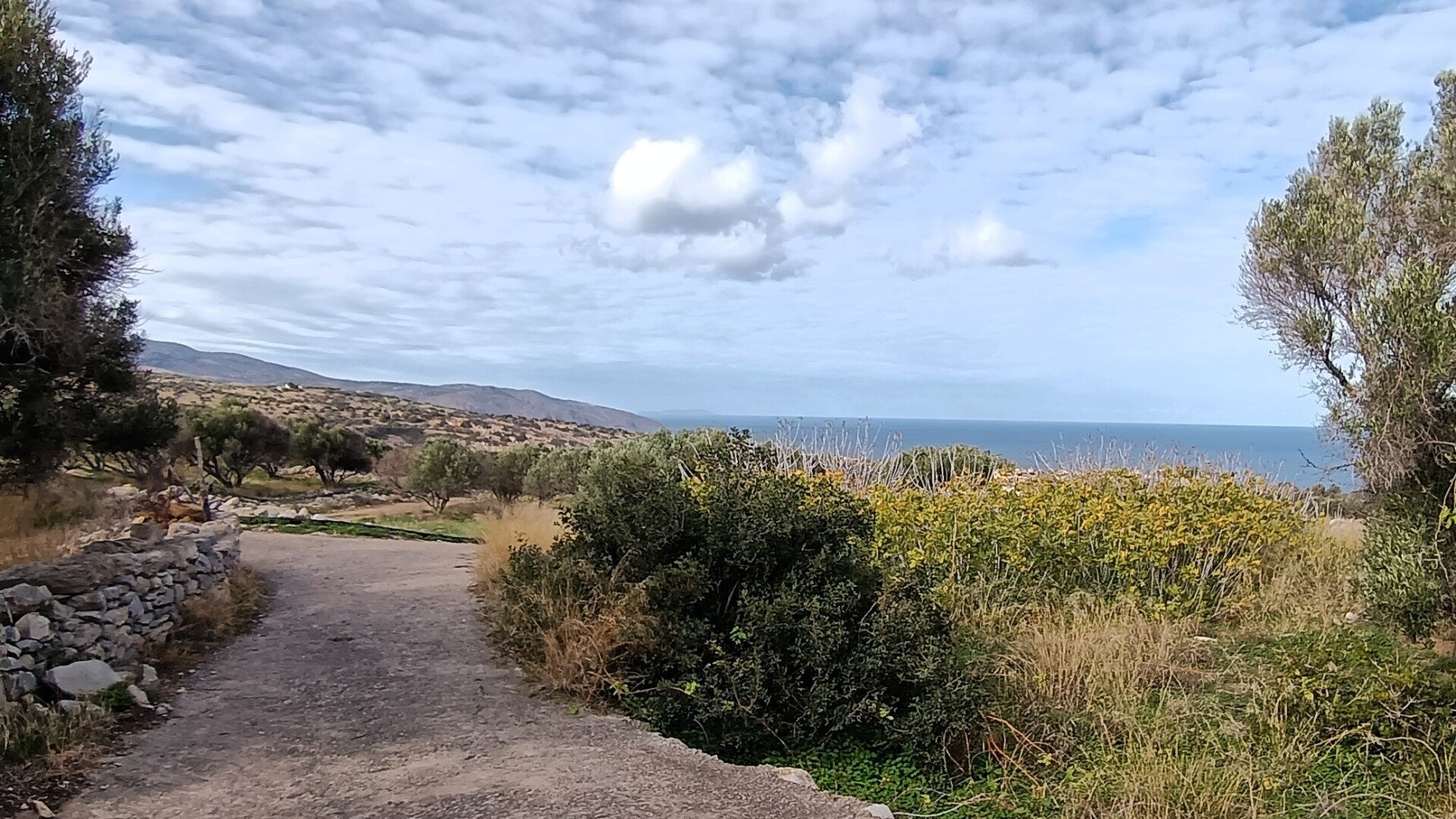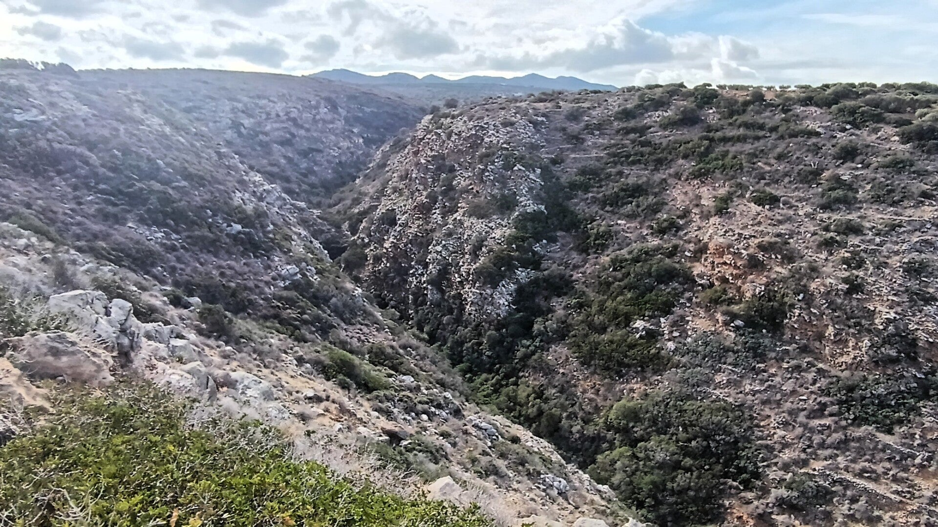 Unterwegs öffnen sich immer wieder Ausblicke auf das Meer, während am Horizont die Anlagen eines Windparks zu sehen sind, die einen interessanten Kontrast zur traditionellen Landschaft bilden. Im weiteren Verlauf verändert sich die Szenerie: Der Weg bietet schließlich einen Blick auf eine kleine Schlucht, die dem Rundgang noch einmal Abwechslung verleiht. Insgesamt handelt es sich um eine entspannte Wanderung ohne große Höhenunterschiede, ideal für alle, die Natur, Geschichte und weite Ausblicke in gemütlichem Tempo genießen möchten.